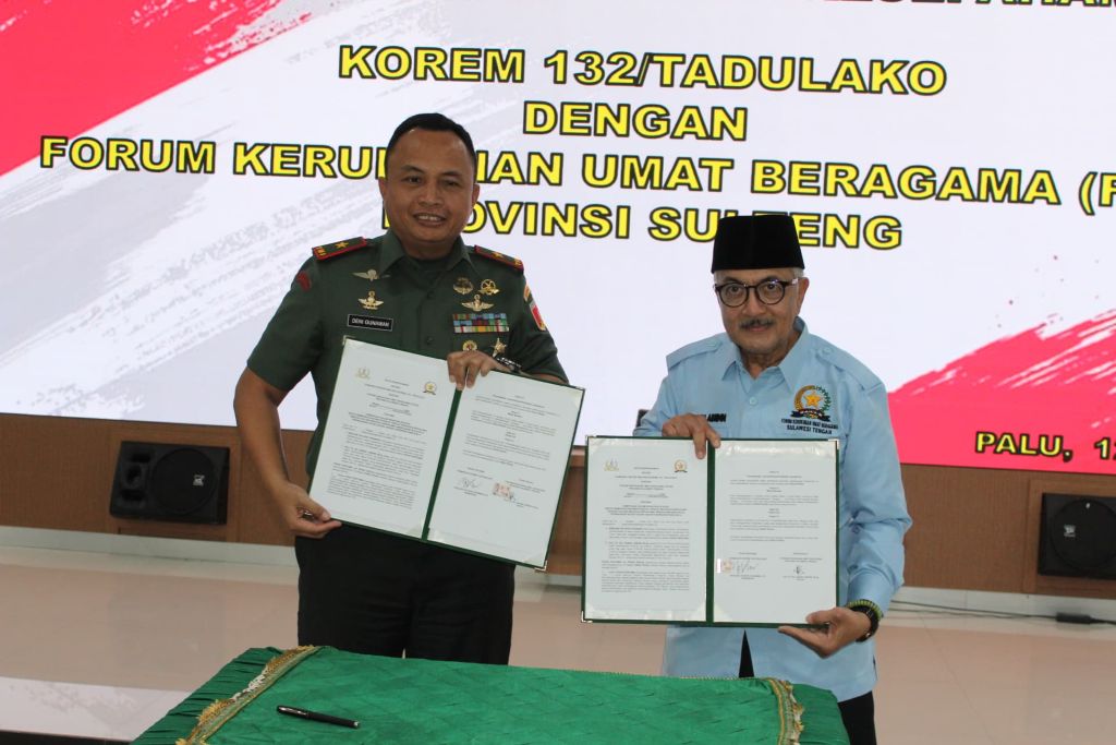 PALU, KAIDAH.ID – Komandan Korem 132/Tadulako, Brigjen TNI Deni Gunawan dan Ketua Forum Kerukunan Umat Beragama (FKUB) Sulawesi Tengah, KH. Zainal Abidin, menandatangani nota kesepahaman (MoU) untuk memperkuat kerukunan antarumat beragama di daerah itu.
