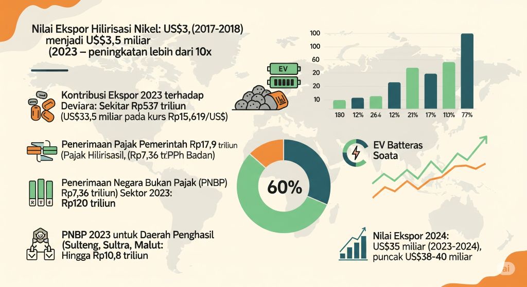 Nilai ekspor produk hilirisasi nikel melonjak dari US$3,3 miliar (2017–2018) menjadi US$33,5 miliar pada 2023, meningkat lebih dari 10 kali lipat. Nilai ekspor nikel hilir ini berkontribusi terhadap devisa negara sekitar Rp 537 triliun pada 2023 (kurs Rp 15.619/US$).