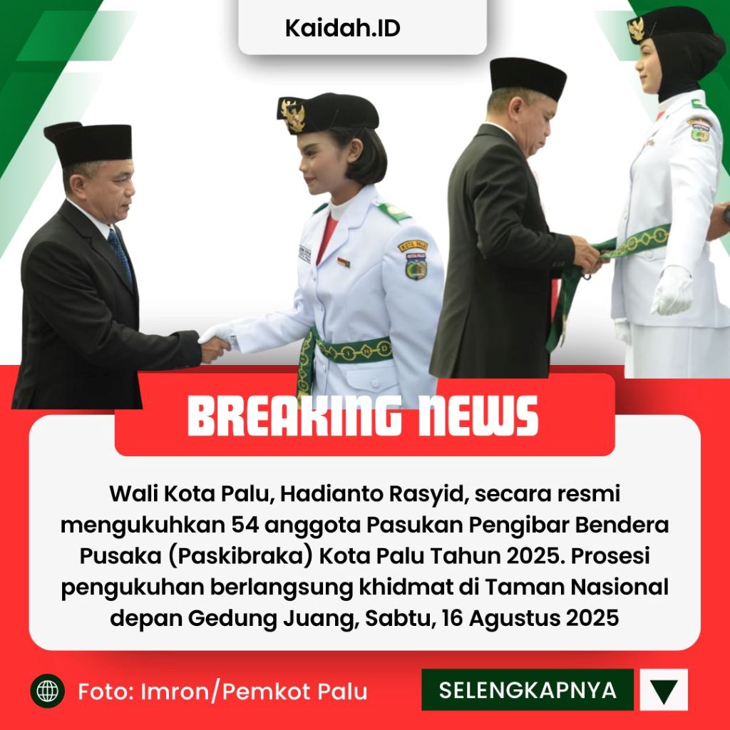 PALU, KAIDAH.ID – Wali Kota Palu, Hadianto Rasyid, secara resmi mengukuhkan 54 anggota Pasukan Pengibar Bendera Pusaka (Paskibraka) Kota Palu Tahun 2025. Prosesi pengukuhan berlangsung khidmat di Taman Nasional depan Gedung Juang, Sabtu, 16 Agustus 2025.