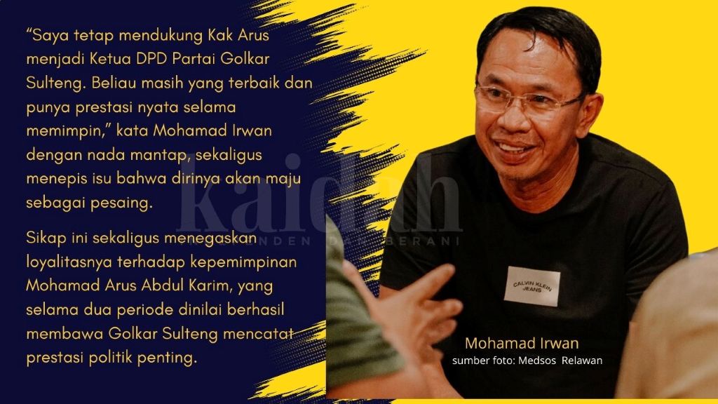 “Saya tetap mendukung Kak Arus menjadi Ketua DPD Partai Golkar Sulteng. Beliau masih yang terbaik dan punya prestasi nyata selama memimpin,” kata Mohamad Irwan dengan nada mantap, sekaligus menepis isu bahwa dirinya akan maju sebagai pesaing.