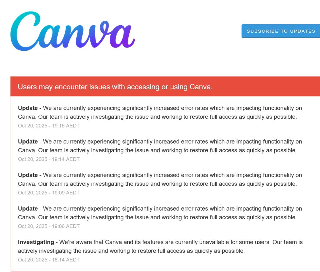 Pihak Canva telah mengonfirmasi adanya peningkatan tingkat kesalahan yang signifikan, dan menyatakan bahwa tim teknisnya sedang berupaya memulihkan akses penuh secepat mungkin. Melalui canvastatus di laman resminya, pihak Canva menyampaikan beberapa pembaruan terkait situasi ini.