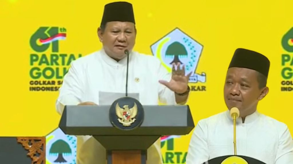 PRESIDEN PRABOWO SUBIANTO berpidato di mimbar, di hadapan ribuan kader Partai Golkar pada Puncak Perayaan HUT ke-61 partai itu, Jumat, 5 Desember 2025 malam di Istora Senayan, Jakarta.