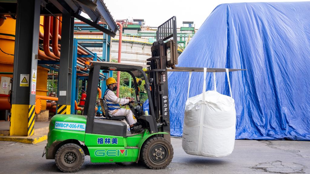Pekerja PT QMB sedang mengoperasikan forklift listrik untuk memindahkan hasil produksi MHP ke gudang penyimpanan | Foto: Humas PT IMIP