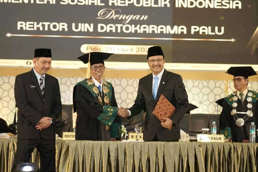 PALU, KAIDAH.ID – Menteri Sosial Republik Indonesia, Saifullah Yusuf, bersama Rektor Universitas Islam Negeri Datokarama, Prof. Lukman Thahir, menandatangani Nota Kesepahaman (MoU) tentang Penyelenggaraan Kesejahteraan Sosial.